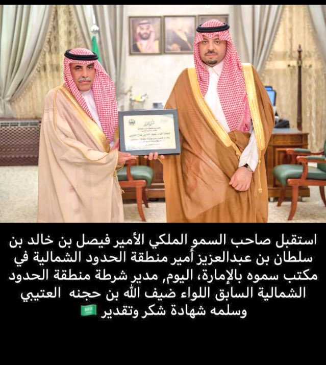ذيب الهيلا A Twitter استقبل صاحب السمو الملكي الامير فيصل بن خالد بن سلطان بن عبدالعزيز امير الحدود الشماله امارة عرعر في مكتب سموه بالاماره اليوم مدير شرطة الحدود الشماليه السابق اللواء ضيف