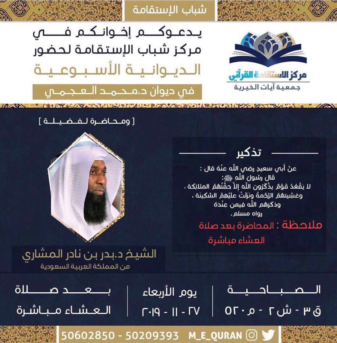 ديوانية الصباحية على تويتر يدعوكم اخوانكم في مركز شباب الاستقامة التابع لمركز آيات الخيرية لحضور الدوانية الاسبوعية محاضرة لفضيلة الشيخ د بدر بن نادر المشاري غدا الأربعاء ٢٧ نوفمبر ٢٠١٩ بعد صلاة