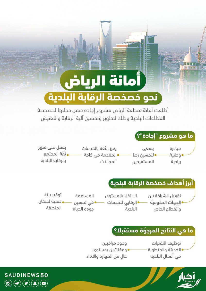 بدأت أمانة منطقة الرياض في خصخصة العمليات التشغيلية للرقابة البلدية داخل نطاق مدينة الرياض بالشراكة مع شركة ع لم المملوكة لصندوق الاستثمارات العامة وتفعيل الشراكة بين الجهات الحكومية والقطاع الخاص بما يحقق. قالت أمانة منطقة الرياض. أزالت أمانة الرياض عددا من التعديات في نطاق بلديات البطحاء. وقالت الأمانة عبر حسابها في تويتر.