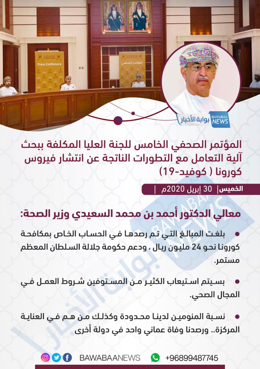 بوابة الأخبار Bawabaa News On Twitter أبرز تصريحات معالي الدكتور أحمد بن محمد السعيدي وزير الصحة في المؤتمر الصحفي الخامس للجنة العليا المكلفة ببحث آلية التعامل مع التطورات الناتجة عن انتشار