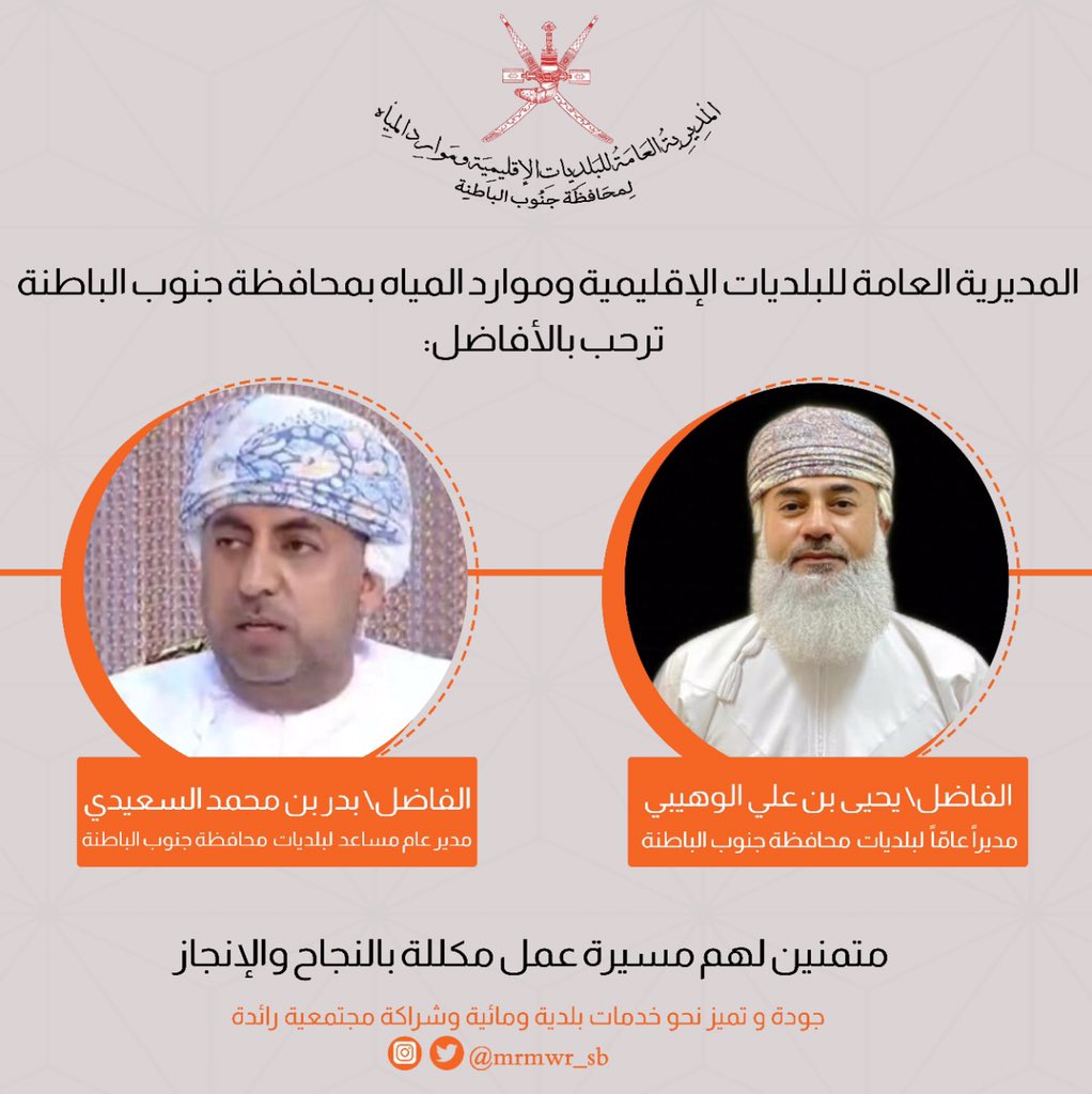 بلدية جنوب الباطنة على تويتر تهنئ بلديات جنوب الباطنة الفاضل يحيى بن علي الوهيبي على انتدابه لاداء مهام مدير عام بالمديرية العامة للبلديات الاقليمية و موارد المياه لمحافظة جنوب الباطنة والفاضل بدر بن محمد السعيدي