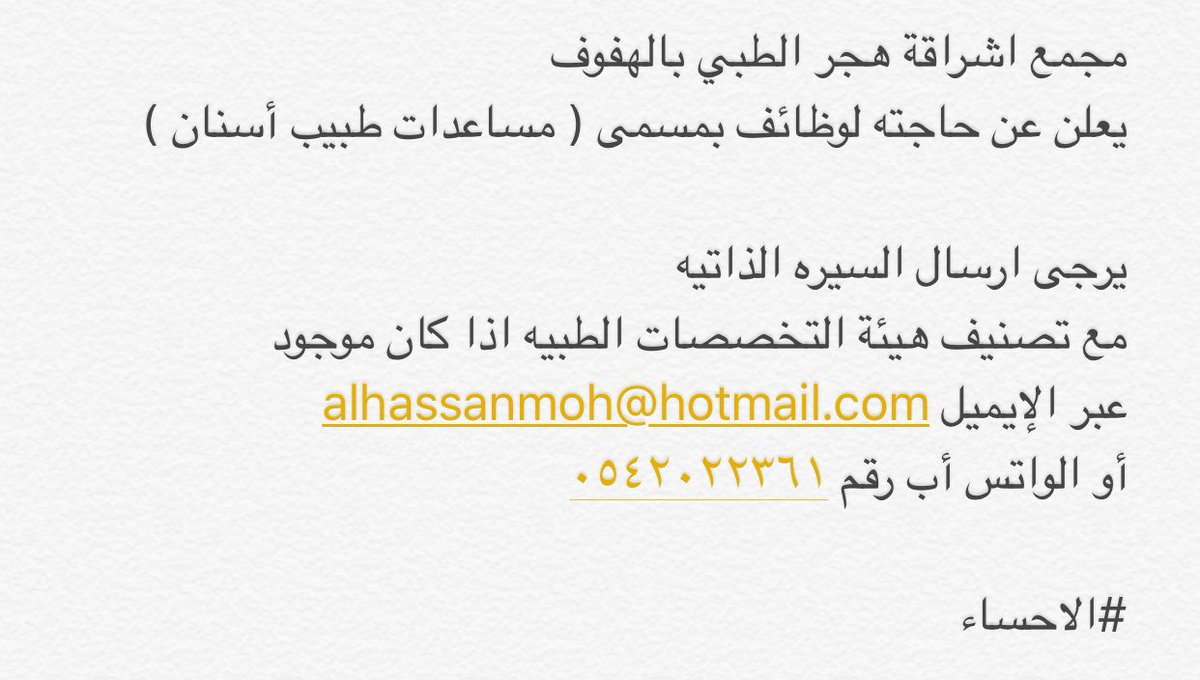 وظائف الأحساء No Twitter مجمع اشراقة هجر الطبي بالهفوف يعلن عن حاجته لوظائف بمسمى مساعدات طبيب أسنان الأحساء الهفوف وظائف
