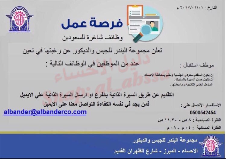 O Xrhsths دليل الأحساء Sto Twitter تعلن مجموعة البندر للجبس والديكور بـ الاحساء المبرز عن رغبتها في تعين عدد من الموظفين