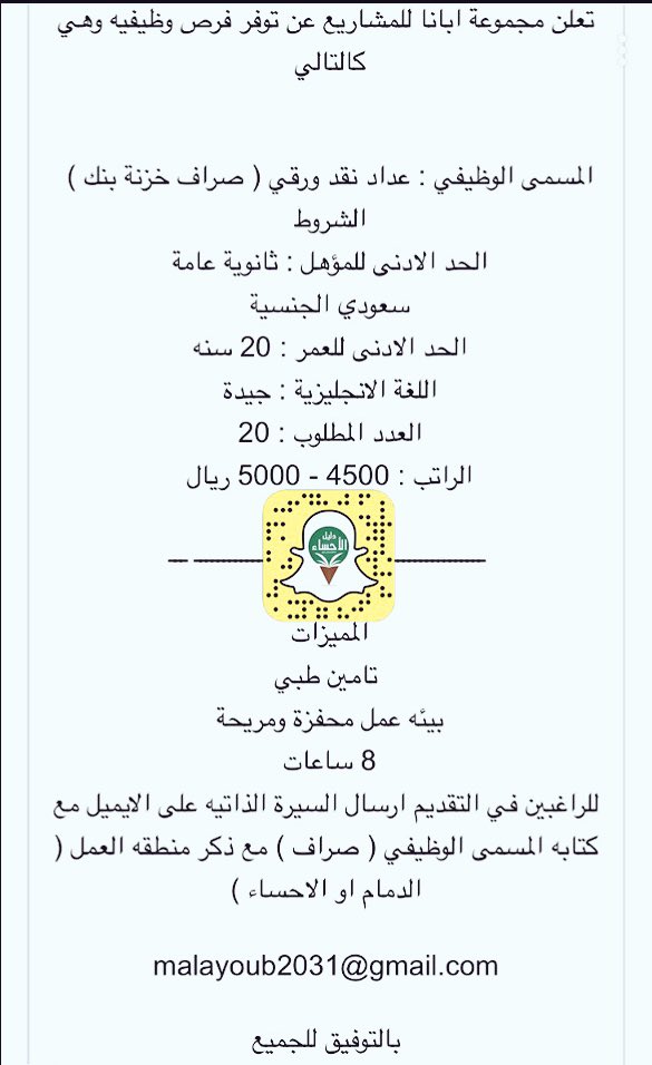 دليل الأحساء Sur Twitter وظيفة صراف خزنة بنك في الاحساء و الدمام مجموعة ابانا للمشاريع