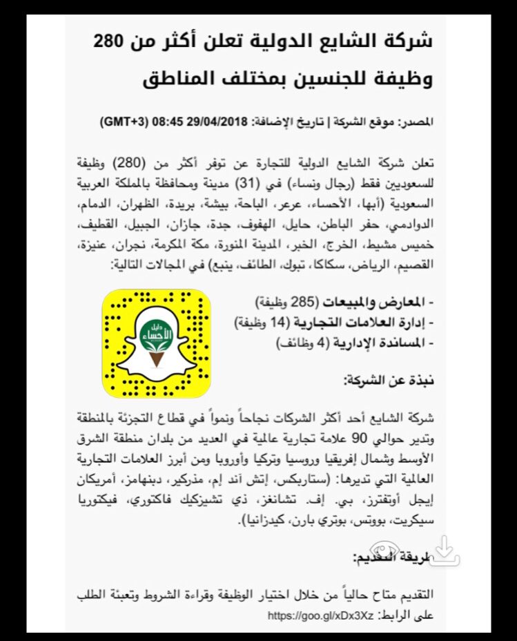 دليل الأحساء V Twitter شركة الشايع الدولية تعلن أكثر من 280 وظيفة للجنسين بمختلف المناطق في الاحساء و الدمام و الظهران و الجبيل و القطيف و الحفر الباذن Https T Co Vzsdl638pq