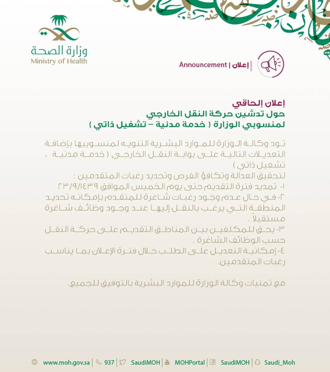 مـ نـ سـ و بـ ي و ز ا ر ة ا لـ صـ حـ ـة On Twitter اعلان الحاقي حول تدشين حركة النقل لمنسوبي الصحه خدمة مدنية تشغيل ذاتي