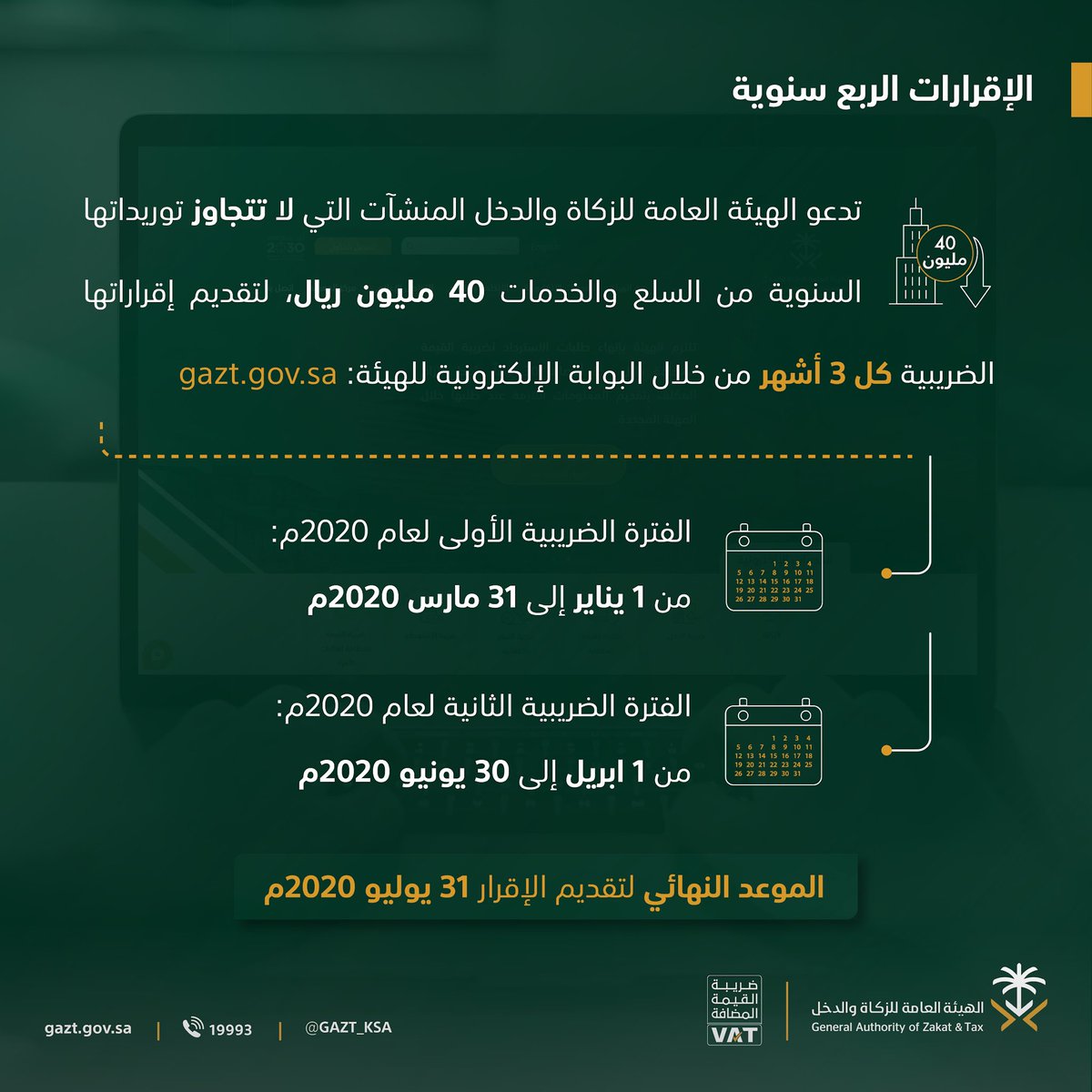 الهيئة العامة للزكاة والدخل On Twitter الزكاة والدخل تدعو المنشآت المسجلة في ضريبة القيمة المضافة إلى تقديم إقراراتها قبل نهاية يوليو 2020م Https T Co Zocnchgx7f Https T Co I2mqsd2166