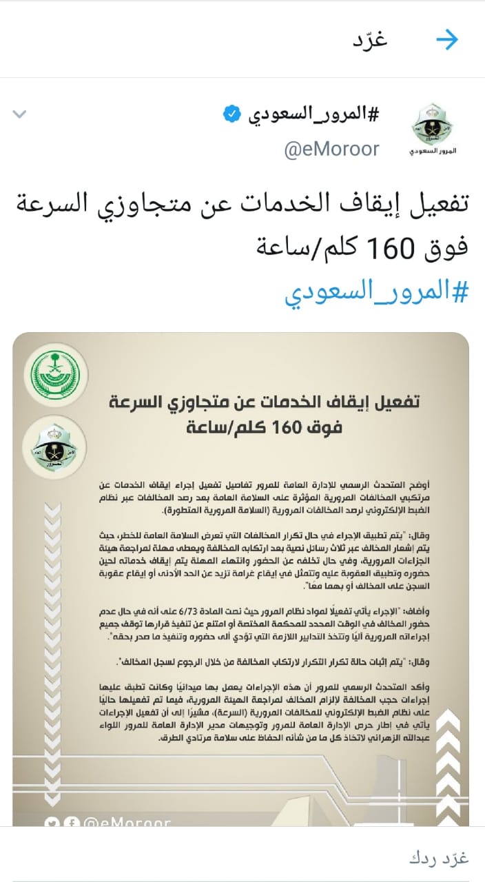 المرور السعودي On Twitter تفعيل إيقاف الخدمات عن متجاوزي السرعة فوق 160 كلم ساعة المرور السعودي Https T Co O25ctsj5uq